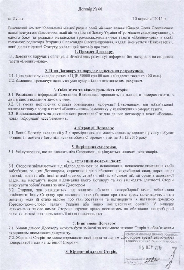 Як повідомляє Володимир Кирилович, за останніх півроку між міським головою Олегом Кіндером та головним редактором газети «Волинь-нова» Олександром Згоранцем укладено два договори: один – від 10 вересня 2015 року на 50 тисяч гривень, другий – від 9 лютого 2016 року на 20 тисяч гривень. Про ціну окремих публікацій тут не йдеться. Проте журналісти зазначають, що ознайомившись із актами здачі-прийому виконаних робіт з надання послуг, стає зрозуміло, що мерія розраховувалася із редакцією за розцінками, які встановлені на політичну рекламу.