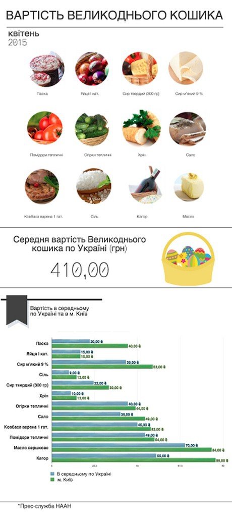 Середня вартість святкового кошика до Великодня у 2015 році становитиме 410 гривень.