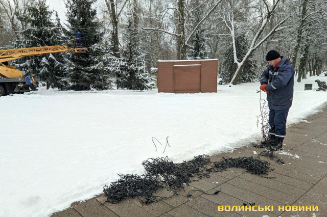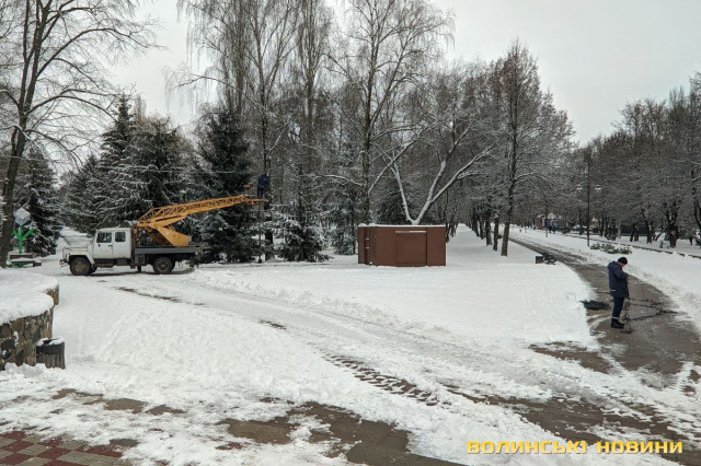 При вході в Центральний парк культури і відпочинку імені Лесі Українки в Луцьку прикрашають дві ялинки. Роботи розпочали в четвер, 15 грудня. Очікується, що їх завершать до 19 грудня.