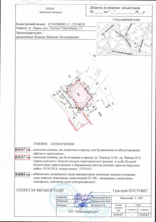 На розгляд депутатів винесли проєкт рішення про надання громадянину Віталію Камцю на умовах оренди земельної ділянки для будівництва та обслуговування офісного приміщення на вулиці Євгена Сверстюка, 11 (площею 0,0167 га).