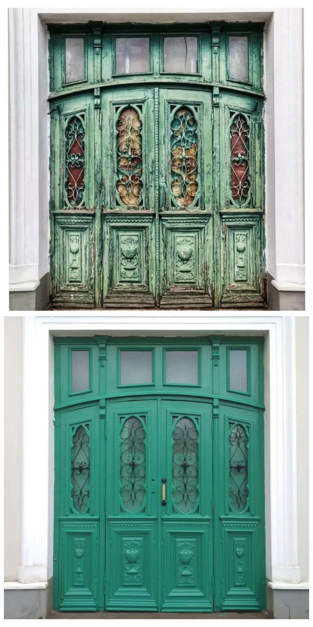 Старі автентичні двері до реставрації виглядають колоритно, багато, з специфічною тектонікою та історичною глибиною і по справжньому ! За ними просто треба було належним чином доглядати ! А то шо з ними зробили - то як штучна підтяжка, гелеві пазурі, силіконові цицьки і варги у білокурих дуреп ! Пошли декого богу молитися ...