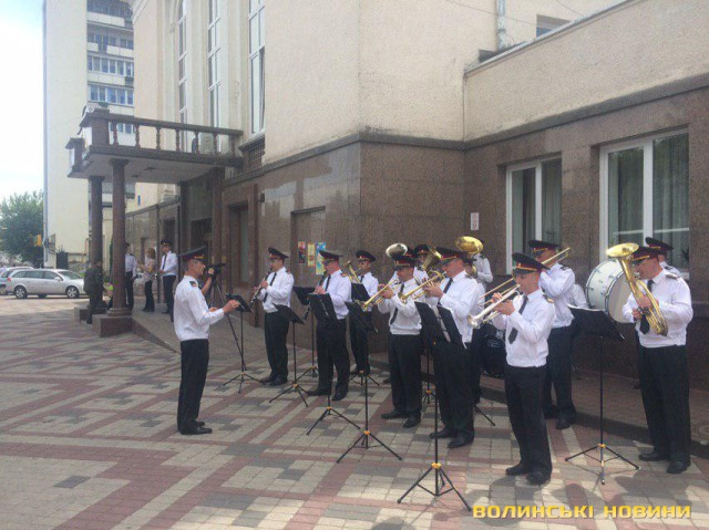 З нагоди 25-ї річниці створення військової частини 1141 Національної гвардії України у центрі Луцька виступає військовий оркестр.