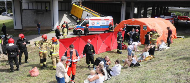 На місці працюють надзвичайні служби. Вже прибула швидка допомога і вертоліт.Канал TVN24 з посиланням на інформацію мерії повідомляє про одного загиблого. Інші ЗМІ наводять дані про щонайменше дві жертви. Також повідомляється про щонайменше 20 постраждалих. Попередньо мова йде про кількох людей у важкому стані.