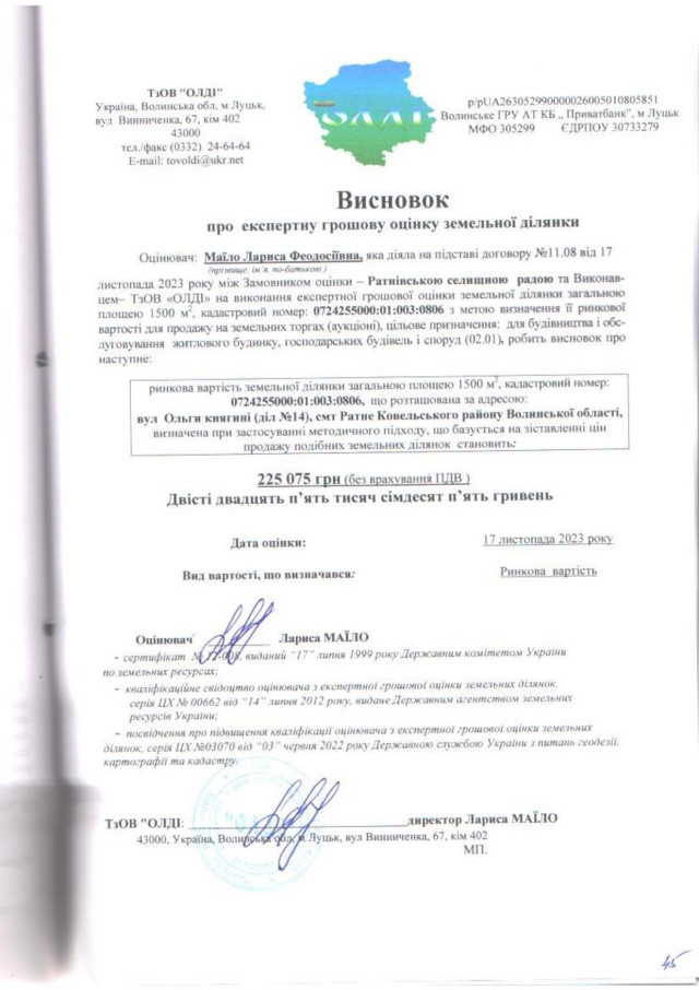 початкова ціна продажу – 225 075 гривень;- земельна ділянка для будівництва і обслуговування житлового будинку, господарських будівель і споруд (присадибна ділянка) площею 0,1203 гектара, що розташована в Ратному на вулиці Княгині Ольги, ділянка №13, кадастровий номер – 0724255000:01:003:0809, категорія земель – землі житлової та громадської забудови,