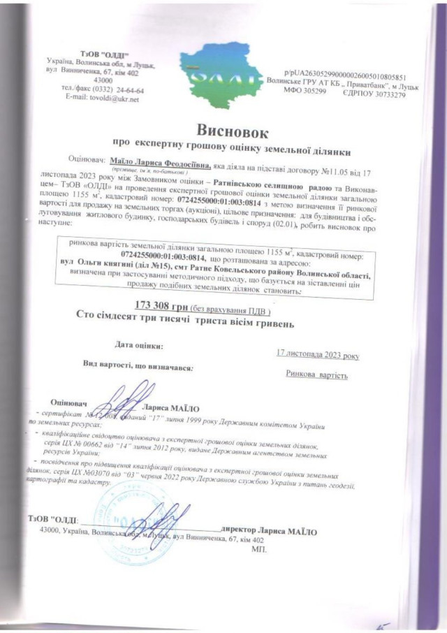 початкова ціна продажу – 173 308 гривень;- земельна ділянка для будівництва і обслуговування житлового будинку, господарських будівель і споруд (присадибна ділянка) площею 0,1155 гектара, що розташована в Ратному на вулиці Княгині Ольги, ділянка №15, кадастровий номер –0724255000:01:003:0814, категорія земель – землі житлової та громадської забудови,