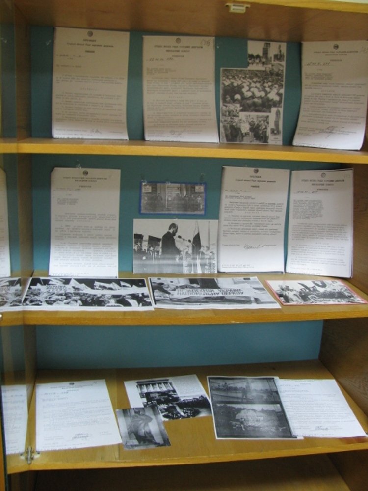 Виставка присвячена Дню Прапора, 20-річчю НРУ та Дню незалежності України, – розповіла начальник відділу інформації та використання документів Державного архіву Волинської області Антоніна Кравчук. Тут можна побачити події у Луцьку 89-90-х років, пікети, документи, видані Луцькою міською радою. Є також матеріали, надані центральними архівами держави, на яких відображена акція голодування студентів біля Софіївського Собору, мітинг біля ВРУ.