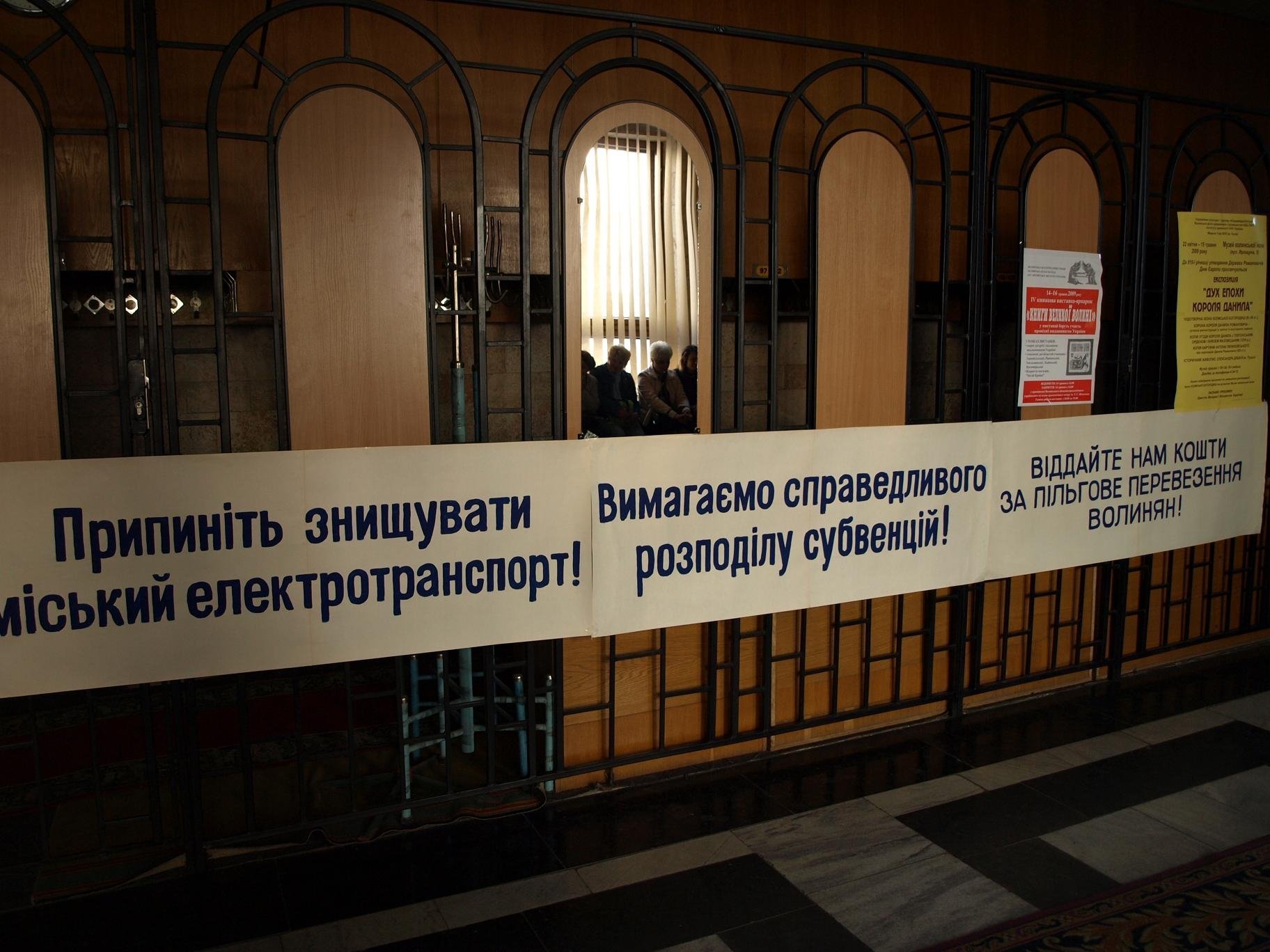 Відомо, що приблизно 150 пікетувальників розмістилися в холлі приміщення Волиньради. Вони тримають транспаранти з гаслами: «Віддайте нам кошти за пільгове перевезення», «Вимагаємо справедливого розподілу субвенцій», «Припиніть знищувати міський електротранспорт».