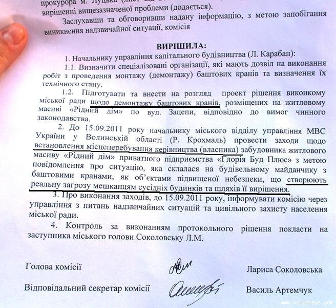 Комісія вирішила доручити начальнику управління капітального будівництва підготувати на засідання виконавчого комітету Луцькради рішення щодо процедури демонтажу крану. Усі ж повноваження щодо пошуку забудовників комісія перенесла на плечі Луцького міськвідділу міліції. Той до 15 вересня повинен знайти забудовника-власника крану.