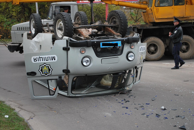 Водій «цивільної» автівки не встиг помітити машину справа, а тому «підрізав» їй задню частину. Після цього машина з правоохоронцями перевернулась і зупинилась «пузом» догори. Очевидці стверджують, що пасажири і водії не постраждали, карети швидкої допомоги помічено не було.
