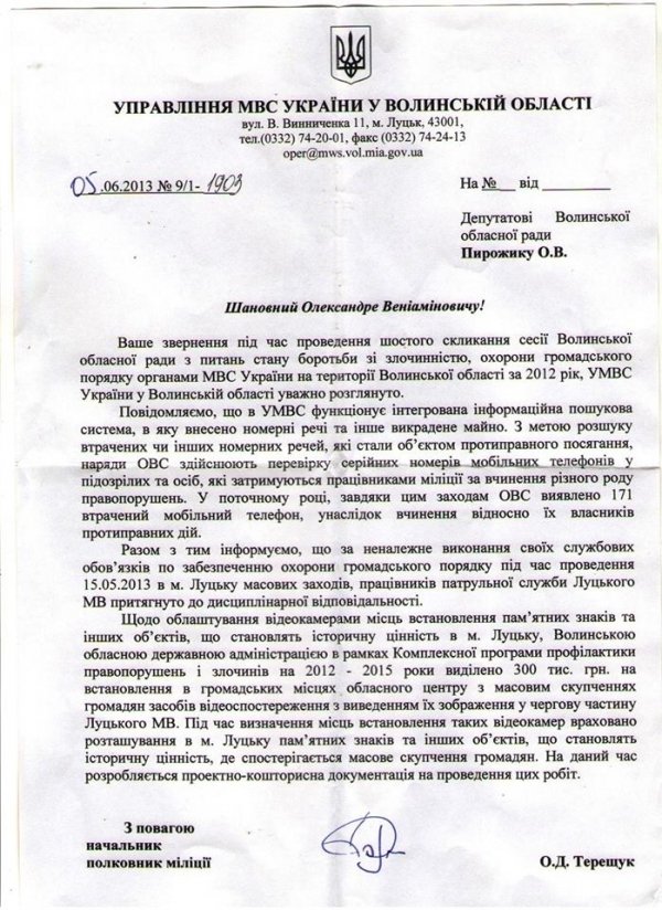 У листі йдеться про те, що «за неналежне виконання своїх службових обов'язків по забезпеченню охорони громадського порядку під час проведення 15.05.2013 в Луцьку масових заходів, працівників патрульної служби Луцького МВ притягнуто до дисциплінарної відповідальності».