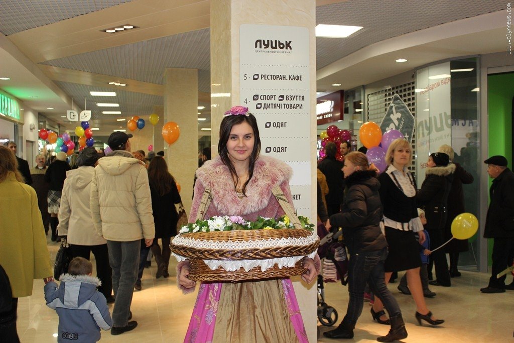 З нагоди відкриття центрального магазину Луцька справжнє дійство для відвідувачів влаштували аніматори, міми, «живі» статуї, актори на ходулях та переодягнені у пишні сукні дівчата з квітами у кошиках. Однак, продавати свій товар панночки не поспішали. Одна з них навіть зазначила: «Це для красоти».