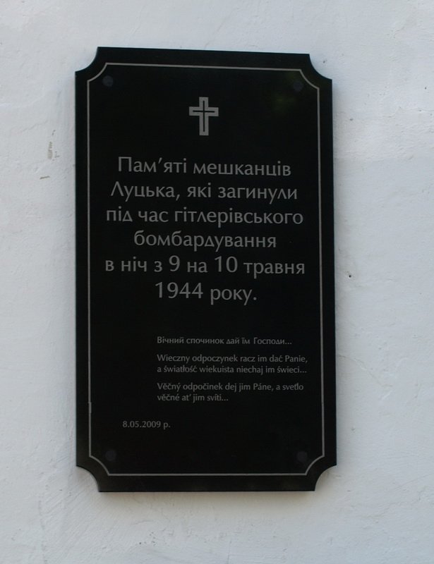 У Луцьку на Замковій площі встановили пам’ятну дошку усім мирним жителям міста, які загинули під час бомбардування у ніч з 8 на 9 травня 1944 року, – повідомляє 8 травня репортер «Волинських Новин».