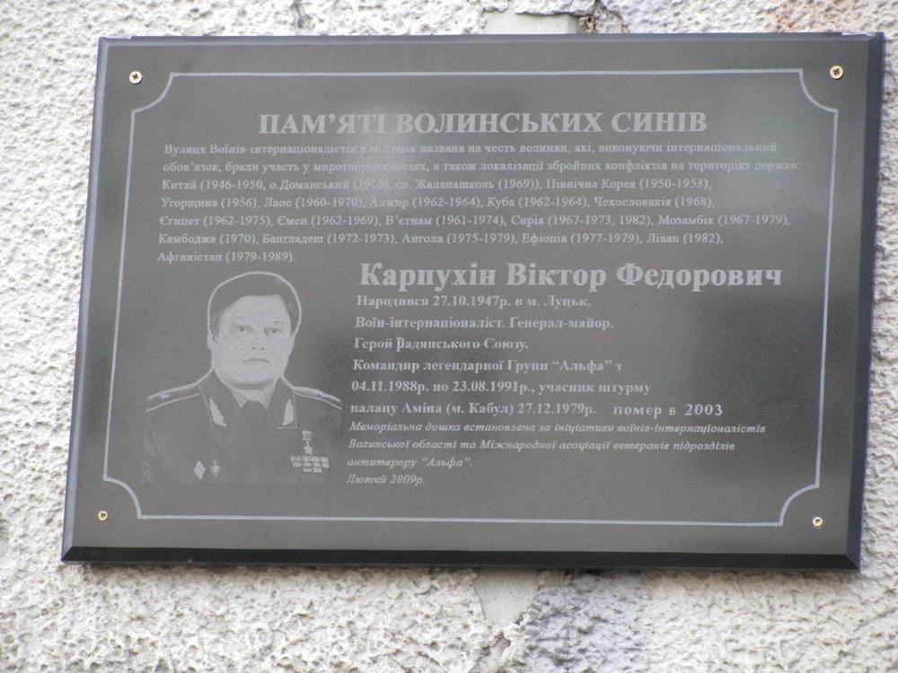 Відкриття меморіальної дошки відбулося на вулиці Воїнів-інтернаціоналістів 1, що в обласному центрі Волині. Вшанувати пам’ять воїна-афганця, Героя Радянського Союзу генерал-майора Віктора Карпухіна зібралися представники влади, Спілки Ветеранів Афганістану, Асоціації ветеранів спецпідрозділу «Альфа»( командиром якої свого часу був Карпухін ), духовенства, лучани.