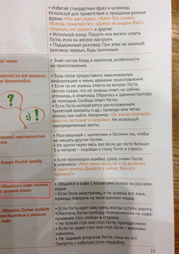 Висновок: у "стандартах обслуживанія гостєй" кофє-хауз порушень явних немає, ну сказано там спілкуватись з колегами на російській мові, та й все. А от все інше - розмова офіціанта, позиції власників мережі, а тим більше їхні слова про 1% "повьорнутих" - це порушення жахливе, за яке навіть захист прав споживачів міг би налкасти на заклад не малий штраф.