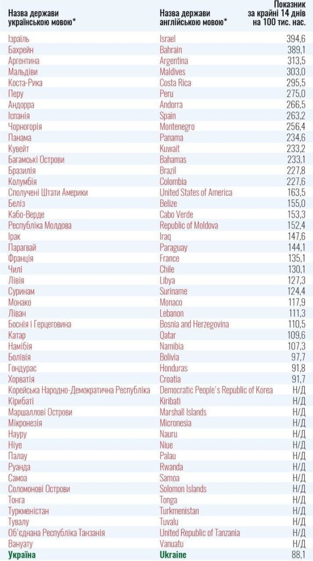 Міністерство охорони здоров’я України оприлюднило новий список країн «червоної» і «зеленої» зон за кількістю заражених коронавірусом. Під час поділу держав беруть до уваги показник захворюваності на 100 тисяч населення за останні 14 днів.