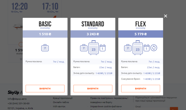 SkyUp пропонує квитки економ класу за трьома тарифами: Basic, Standard і Flex.