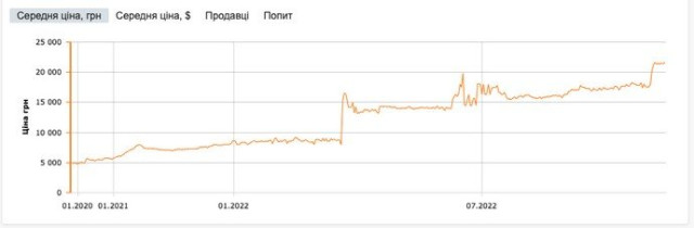 Ціни на більшість моделей за час війни зросли удвічі. За даними сервісу hotline.ua, одна з найпопулярніших серед покупців модель генератора Werk WPG3600 наприкінці лютого коштувала близько 9 тис грн.Після початку війни вартість генератора зросла удвічі, а в останній тиждень жовтня – ще на 5 тис. Подорожчання продиктоване винятково значним попитом: середня ціна в доларах зросла на понад 100 дол.Зростання середньої ціни на бензиновий генератор Werk WPG3600. Джерело: hotline.ua