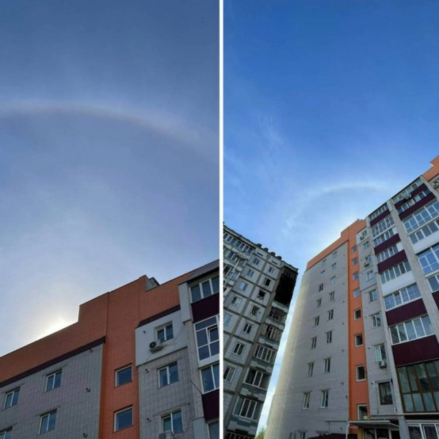 Користувачка Лариса Кучер сфотографувала гало в Умані Черкаської області над багатоповерхівкою, в яку 28 квітня влучила російська ракета.