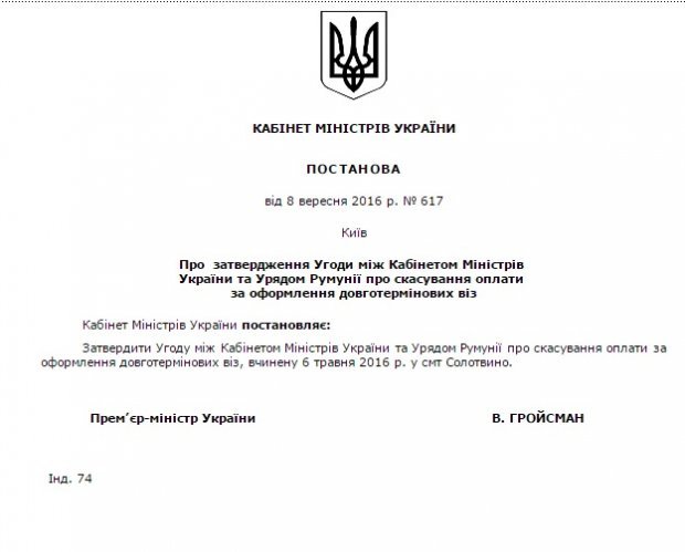 З метою набрання чинності Угоди між Кабінетом Міністрів України та Урядом Румунії про скасування оплати за оформлення довготермінових віз 20 квітня 2016 року Уряд прийняв постанову "Про затвердження Угоди між Кабінетом Міністрів України та Урядом Румунії про скасування оплати за оформлення довготермінових віз", – йдеться у документі.