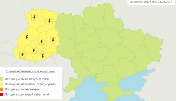 25 серпня в західних областях грози, подекуди град та шквали 15-20 метрів за секунду, – йдеться у повідомленні.
