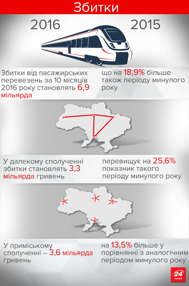 Разом тим, як повідомляє 24 канал, збитки "Укрзалізниці" від пасажирських перевезень за 10 місяців 2016 року становлять 6,9 мільярда гривень. Такі дані надала "Укрзалізниця" на запит журналістів сайту.