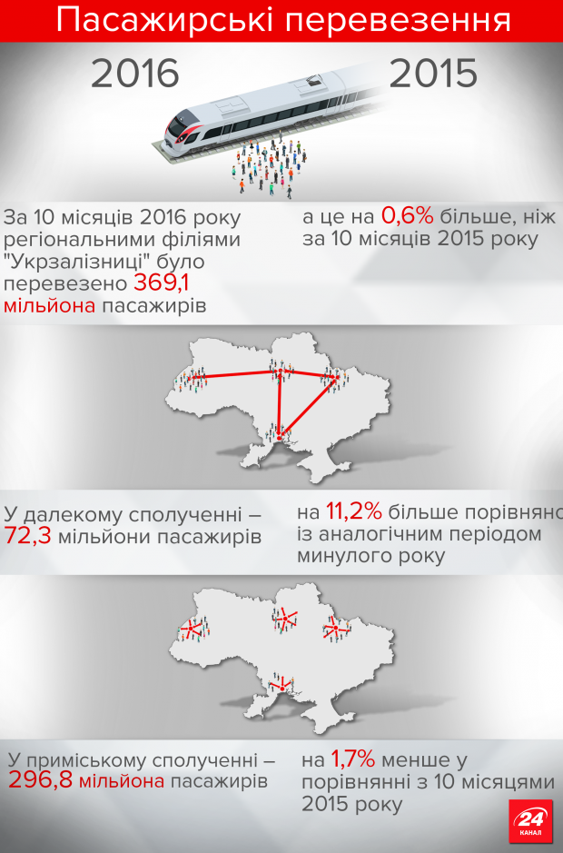 За 10 місяців 2016 року регіональними філіями "Укрзалізниці" було перевезено 369,1 мільйона пасажирів, а це на 0,6% більше, ніж за 10 місяців 2015 року. У далекому сполученні – 72,3 мільйони пасажирів (на 11,2% більше порівняно із аналогічним періодом минулого року)