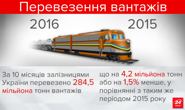 За 10 місяців залізницями України перевезено 284, 5 мільйона тонн вантажів, що на 4,2 мільйона тонн або на 1,5% менше, у порівнянні з таким же періодом 2015 року.