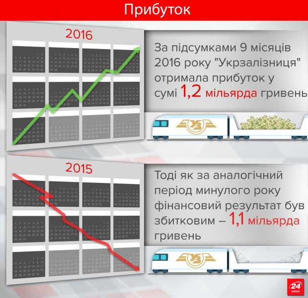 За підсумками 9 місяців 2016 року "Укрзалізниця" отримала прибуток у сумі 1,2 мільярда гривень, тоді як за аналогічний період минулого року фінансовий результат був збитковим – 1,1 мільярда грн.Збитки