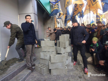 Представники партії «Національний корпус» влаштували акцію, під час якої замурували відділення «Сбербанку России» на Золотих воротах в Києві.
