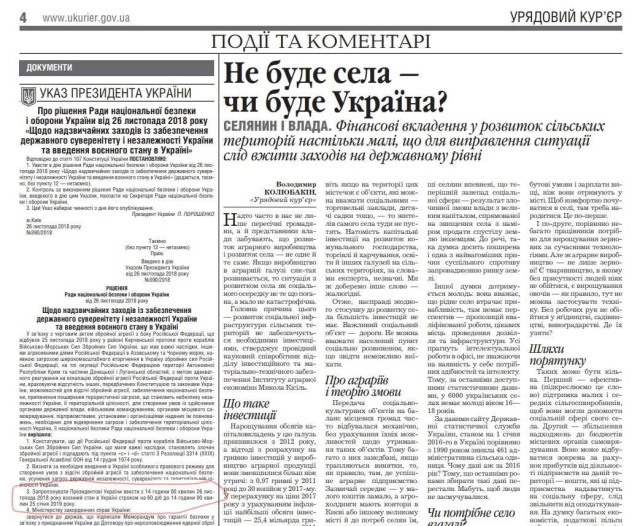 В офіційній газеті Кабінету міністрів України "Урядовий кур'єр" опубліковано указ президента Петра Порошенка про Воєнний стан в Україні. Повний текст закону і ключових документів введення воєнного стану на 60 діб від 14:00 26 листопада. Хоча вчора, 27 листопада, у Раді вирішили ввести воєнний стан на 30 діб від 9:00 28 листопада на території 10 областей, повідомляє ТСН.