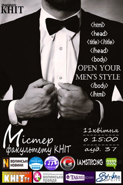 «Студентська рада факультету КНІТ запрошує взяти участь у заході «Містер факультету КНІТ». Настав час обрати найрозумнішого, найвинахідливішого, найгарнішого, найкреативнішого і взагалі най-найкращого хлопця факультету!» - пишуть організатори заходу.