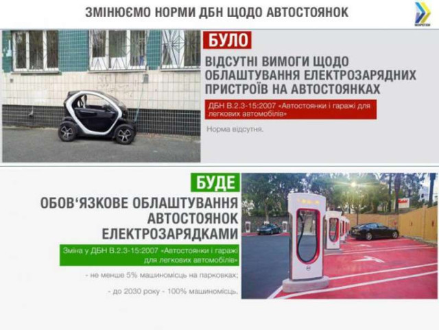 Так, зі слів заступника міністра Лева Парцхаладзе, в нових державних будівельних нормах (ДБН) міститься пункт про обов'язкове облаштування електричними зарядними пристроями не менше 5 % місць для авто в громадських гаражах і автостоянках.