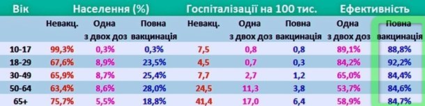 10-17 років: 88,8% після двох доз, 89,1% - після першої;