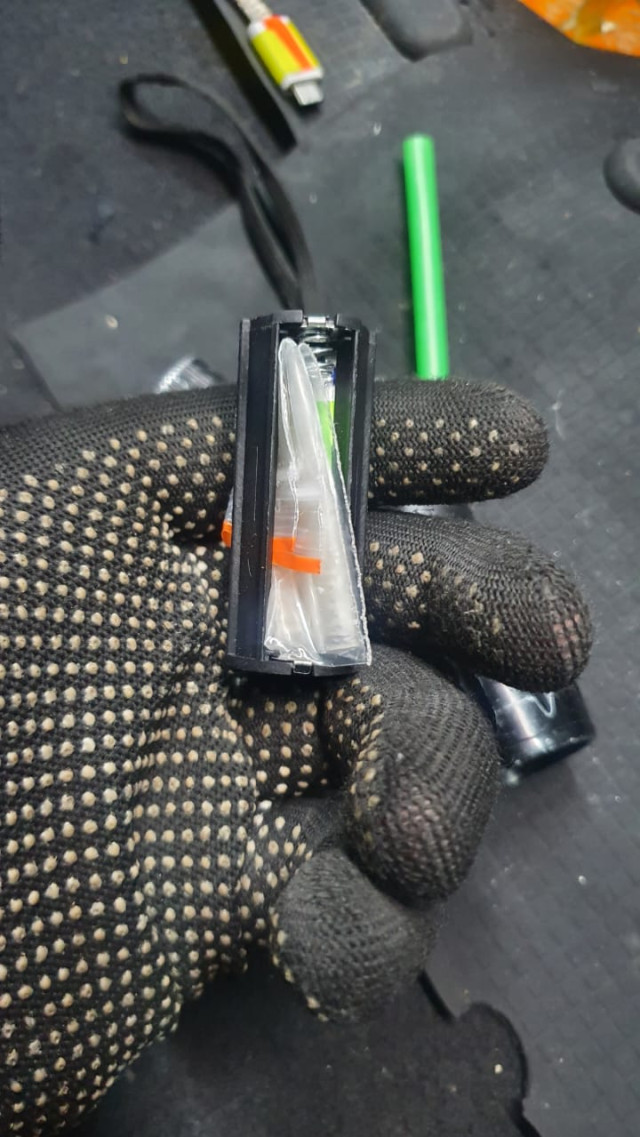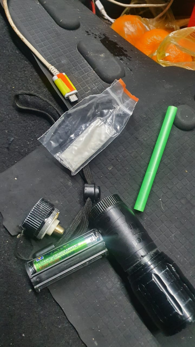 А керманич іншої вантажівки ретельно запакував пакетик з кристалічною речовиною білого кольору в замін батарейки у ліхтарик. Провівши експрес-аналіз, правоохоронці з'ясували, що знайдена речовина являється амфетаміном. Виявити знахідку оглядовій групі також допоміг чотирилапий помічник, який зреагував на предмет.
