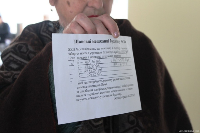 З її слів, у відповідь на прохання про ремонт мешканці багатоповерхівки отримали два листи, в одному з яких обіцяли здійснити роботи у третьому кварталі року, в іншому повідомляли, що їх не здійснять взагалі. Згодом з ЖКП №3 по телефону повідомили, що мешканка квартири №71 має заборгованість, і її справу передали до суду. Як розповіла Людмила Тимощук, насправді зазначена особа померла 10 років тому.
