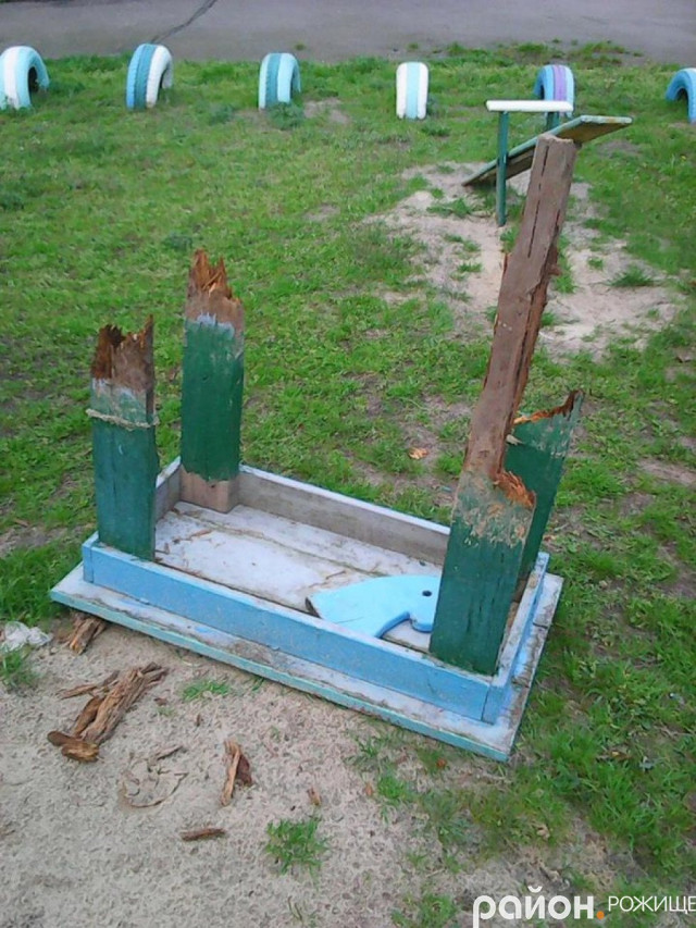 А після вихідних дитячий майданчик і майданчиком не назвеш: лавки повиривали з землі і покидали, столика теж вирвали «з м'ясом». З гойдалок поздирали «коників», за яких дітки трималися, коли гойдалися. Їх там лишалося всього два, то й тих уже нема», - скрушно розповів чоловік.