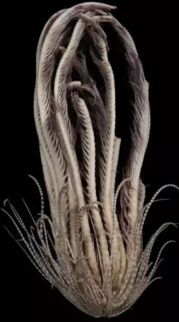 «Ми прибрали купу вусиків, щоб ви могли бачити частини, до яких вони прикріплені, і це те, що схоже на полуницю», – сказав він.Дослідник додав, що вусики мають крихітні пазурі на кінці, які використовуються, щоб триматися за морське дно. Так звані руки – довші та схожі на пір’я. Вони допомагають істоті рухатися.