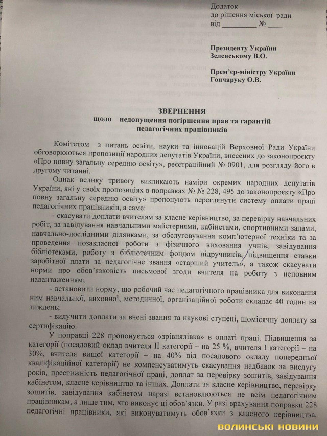 «Ці зміни значно погіршать і так слабке матеріальне становище та соціальну захищеність педагогів. З цього приводу ми, луцькі депутати, підготували відповідне звернення до Президента України Володимира Зеленського та Прем’єр-міністра України Олексія Гончарука.
