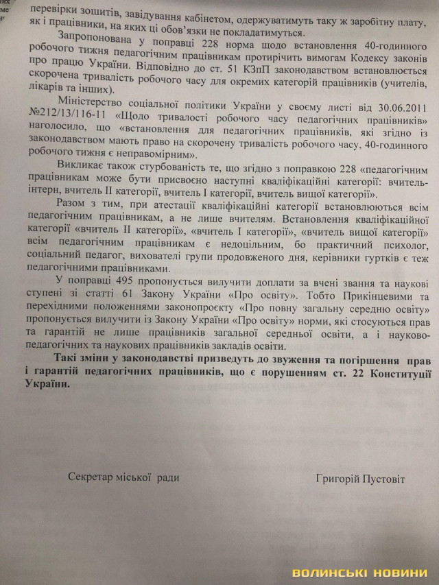 Також луцькі депутати стурбовані намірами народних обранців щодо вилучення доплати за вчені та наукові ступені, щомісячну доплату за сертифікацію; встановлення норми, що робочий час педагога для виконання ним виховної, навчальної, методичної та організаційної роботи становить 40 годин на тиждень.