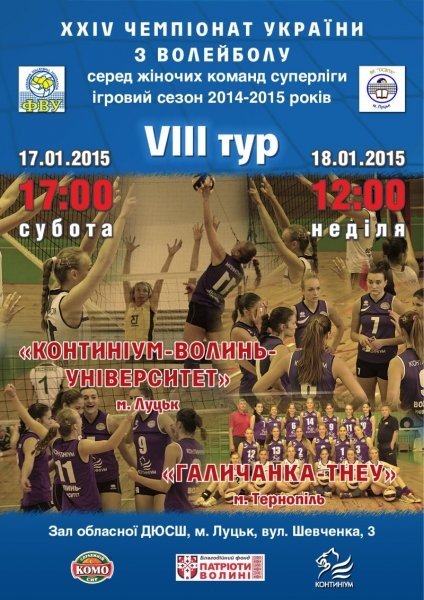 17 та 18 січня в залі обласної дитячо-юнацької спортивної школи у Луцьку жителі міста та гості матимуть можливість спостерігати та підтримати своїх улюблених спортсменів у поєдинках чергового туру чемпіонату України з волейболу серед жіночих команд суперліги.