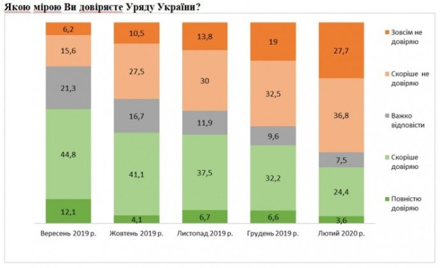 Разом з тим, зріс рівень негативізму і в оцінці діяльності інших депутатських фракцій та груп.Уряду у вересні 2019 р. довіряли 57% респондентів, не довіряли ˗ 22%, у лютому 2020 року ˗ відповідно 28% і 64,5%.В опитуванні взяли участь 2018 респондентів віком від 18 років у всіх регіонах України, за винятком Криму та окупованих територій Донецької та Луганської областей за вибіркою. Теоретична похибка вибірки (без врахування дизайн-ефекту) не перевищує 2,3% з імовірністю 0,95.