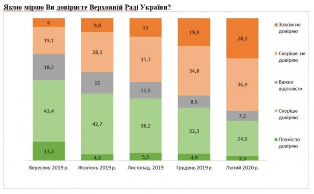У вересня 2019 року, після обрання нового складу Верховної Раді, їй довіряли 57% опитаних, не довіряли ˗ 25%, у лютому 2020 року ˗ відповідно довіряють 28% і не довіряють 65%.