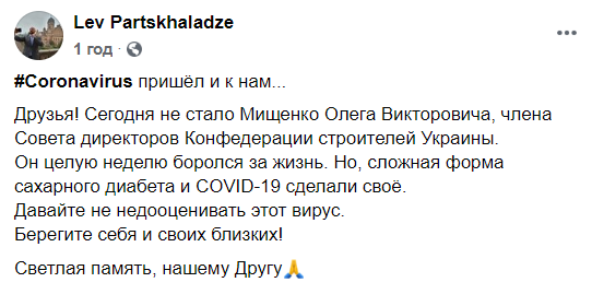 За словами Парцхаладзе, у Міщенка, який був членом Ради директорів будівельників України, минулого тижня діагностували коронавірус. Сьогодні екс-заступник голови Київської ОДА помер у лікарні.