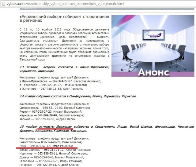 За два місяці до того, як в Україні розпочався Євромайдан, «Український вибір» спільно з тоді ще не забороненою Комуністичною партією України ініціював збір підписів для проведення референдуму за вступ до Митного союзу Росії. Як один з координаторів «Українського вибору» у Луцьку, Назар Романюк збирав підписи за об’єднання з РФ у спільний союз та всіляко агітував за це волинян.До слова, згодом аналогічний інструмент волевиявлення населення використали задля легітимізації анексії Криму та так званих самопроголошених «Л/ДНР».