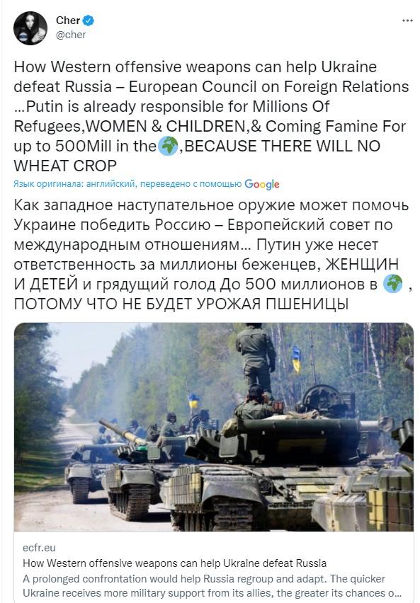 В описі до публікації Шер додала: «Путін вже несе відповідальність за мільйони біженців, жінок і дітей, майбутній голод до 500 мільйонів, тому що не буде врожаю пшениці».Раніше відомий актор Шон Пенн закликав міліардерів допомогти Україні, купивши літаки, які перевершують РФ. А актриса Наталі Портман опублікувала в Instagram пост на підтримку українців під час російської війни.
