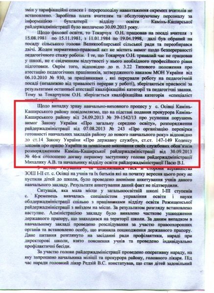 Андрій Парака повідомив: «На усунення порушеннь прав дітей, які навчаються у загальноосвітній школі І-ІІ ступенів села Осівці Камінь-Каширського району, на здобуття освіти та безпечні і нешкідливі умови навчання , прокуратурою області 6 вересня 2013 року голові Волинської обласної державної адміністрації внесено подання, за результатами розгляду якого заступника голови Камінь-Каширської райдержадміністрації Андрія Михалика, начальника відділу освіти Камінь-Каширської райдержадміністрації Віктора Пася притягнуто до дисциплінарної відповідальності. А саме, як зазначено у відповіді, за неналежне виконання службових обов’язків розпорядженням голови РДА від 30 вересня 2013 зазначеним чиновника оголошено догану», - йдеться у повідомленні.