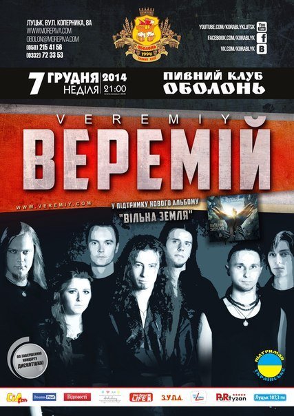 Київський рок-гурт "Веремій" везе у Луцьк новий альбом під назвою "Вільна Земля". Про це йдеться на сторінці гурту в мережі.