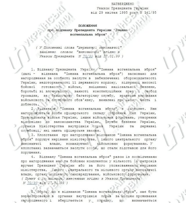 У 1995 році президент Леонід Кучма підписав Указ №341, де прописав вимоги до вручення іменної зброї. Таку державну нагороду могли отримати "особи офіцерського складу ЗСУ, Державної прикордонної служби, інших військових формувань, створених відповідно до законодавства України, СБУ, МВС, а також державні службовці, які мають офіцерське звання".