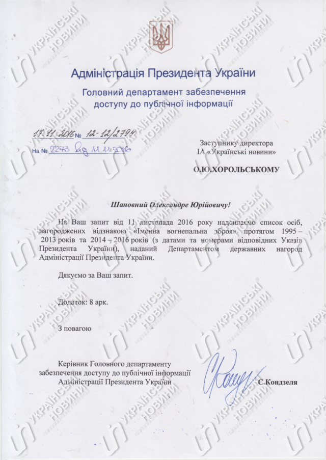 Журналісти вирішили з’ясувати імена всіх нагороджених єдиною законною нагородою у вигляді вогнепальної зброї - "Іменною вогнепальною зброєю" від Президента України.