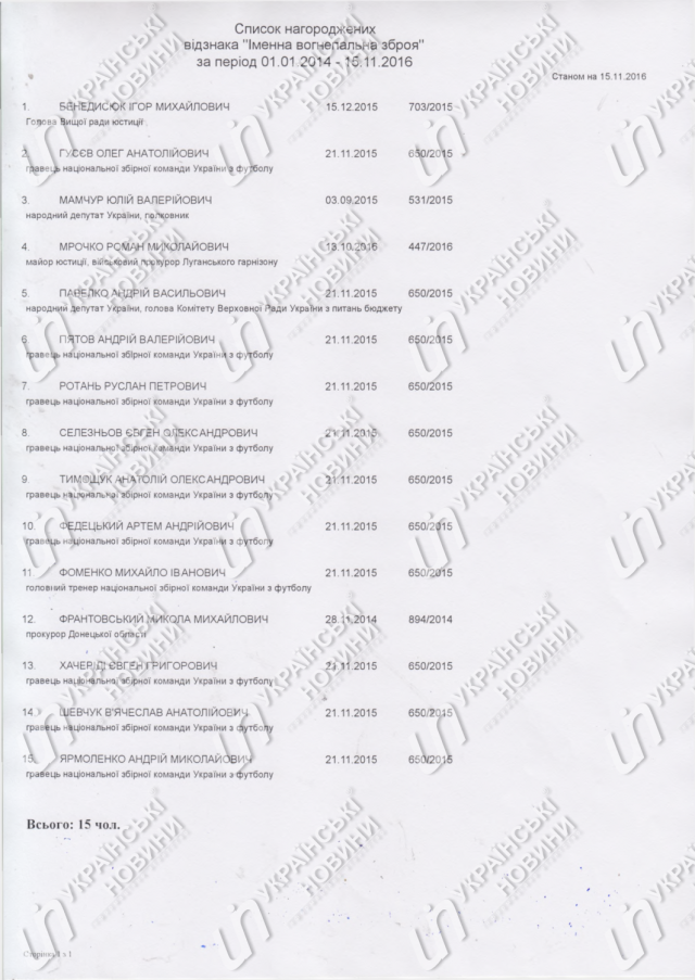 Чинний президент Петро Порошенко встиг відзначитися нагородженням в листопаді 2015 року цілої футбольної команди. Указом №650 від 21 листопада іменні пістолети були вручені 9 футболістам збірної України, тренеру команди та голови Федерації футболу України.